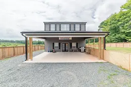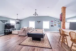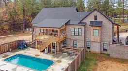 Wood Beams with Vaulted Ceilings. Shiplap fireplace double-sided to the living room. #whitewoodestate